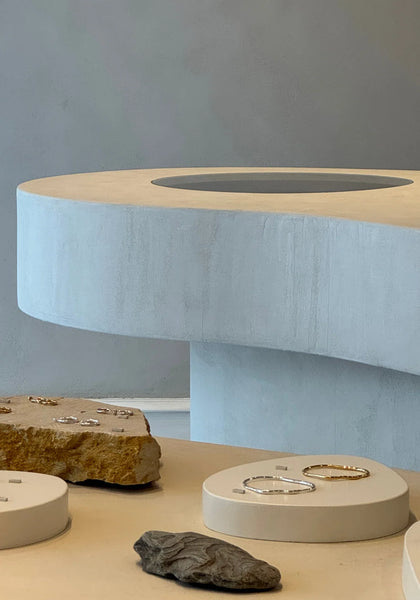 Because the emphasis on nature was so important to us, we decided to work with natural materials. To cover our walls, we chose a clay plaster which is made of sediments of stone. What we love most about this material is that the clay plaster actually makes the space more breathable and * can absorb toxins from the air. Visually, it is aesthetically calming and evokes a peaceful feeling, just as you would have as spending time in nature. It took a lot of effort and time to cover all of our walls with this natural material from laying the foundation to applying layers of the plaster. To cover our furniture, we used a similar natural stone plaster. We found treasure when we discovered where to source off-cuts of raw stones which we use today for displaying our jewelry pieces.