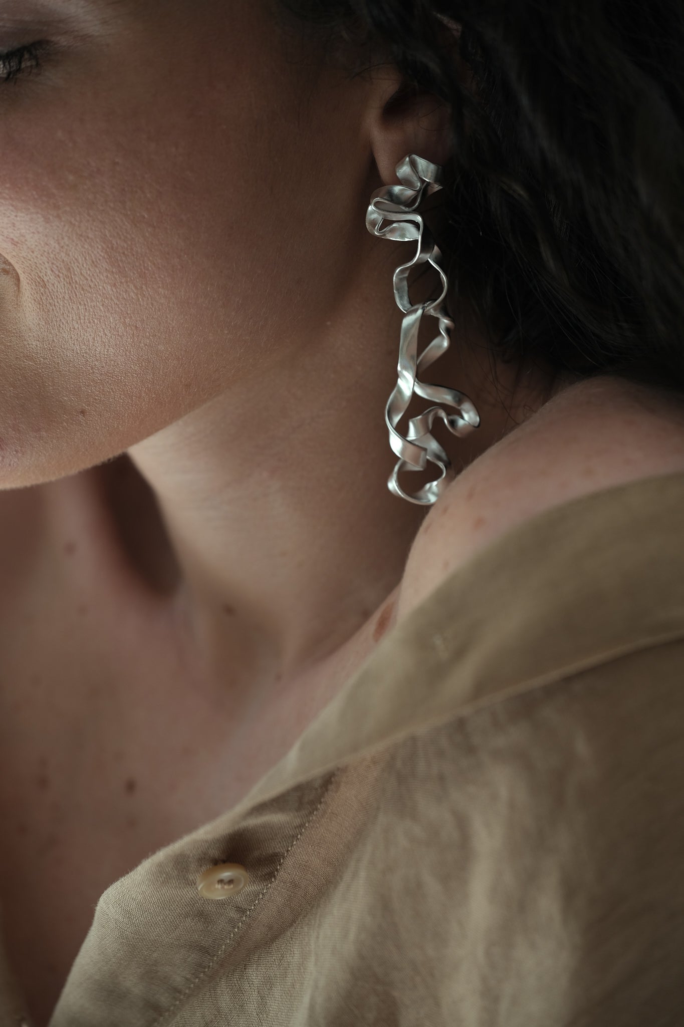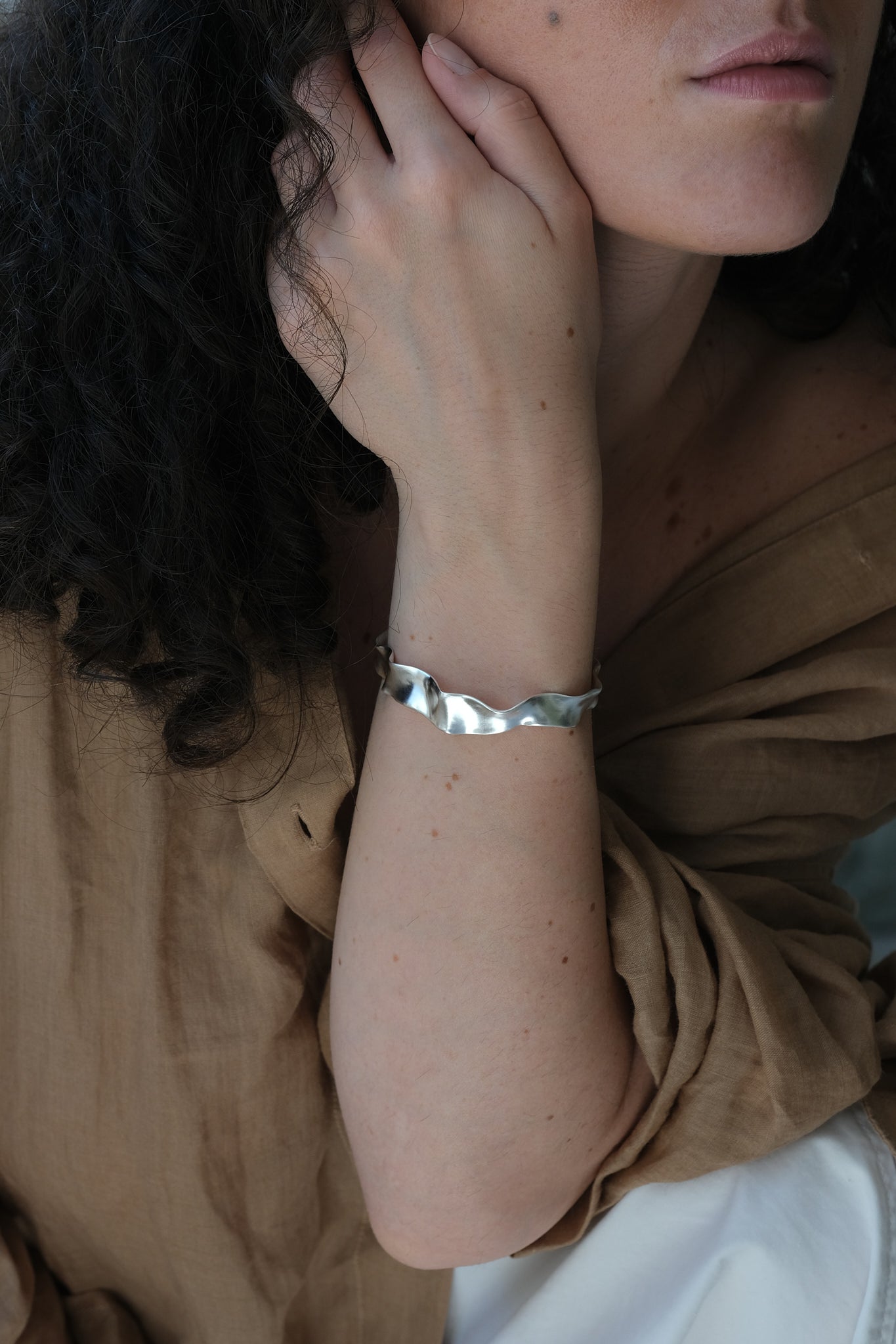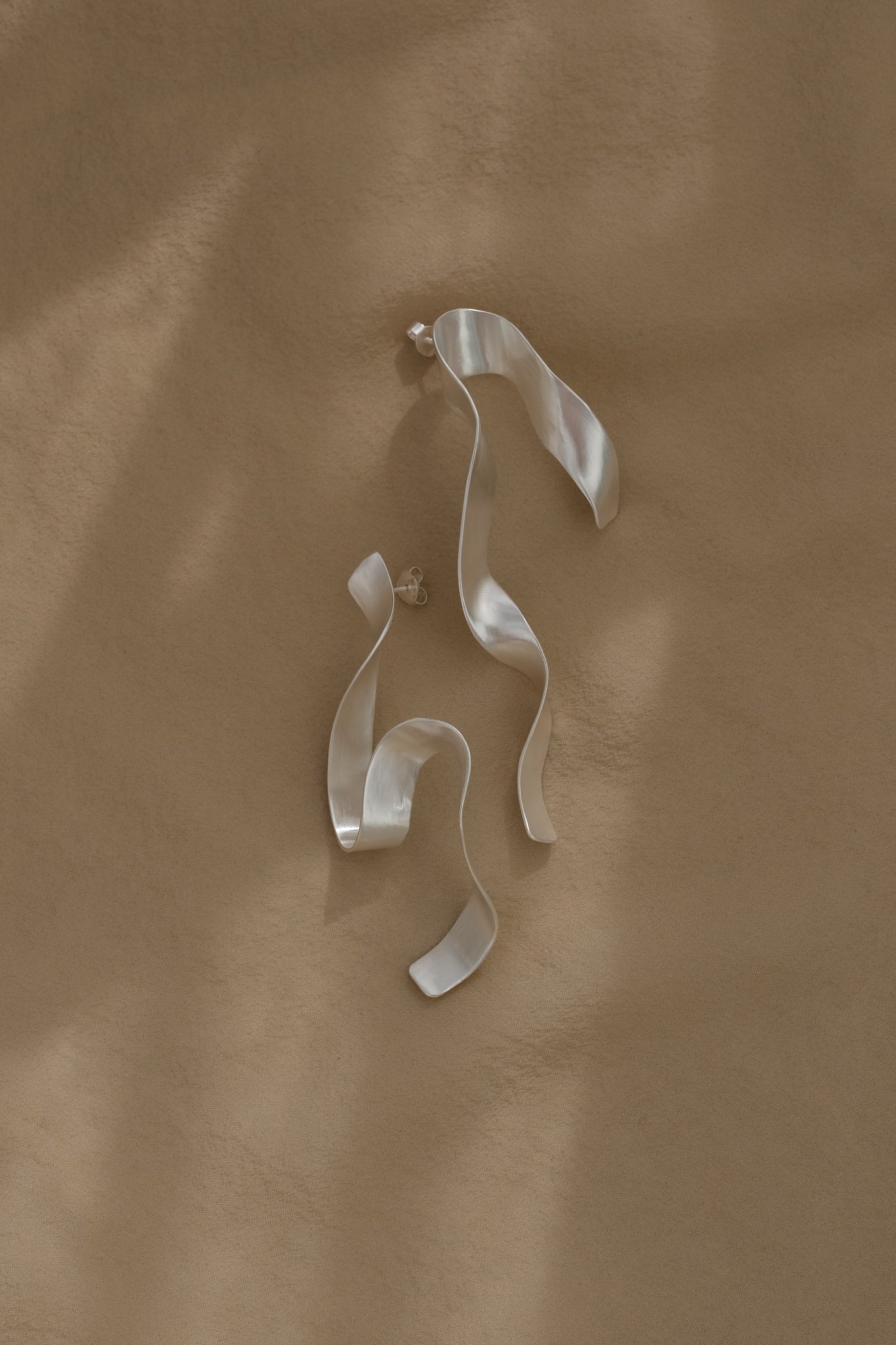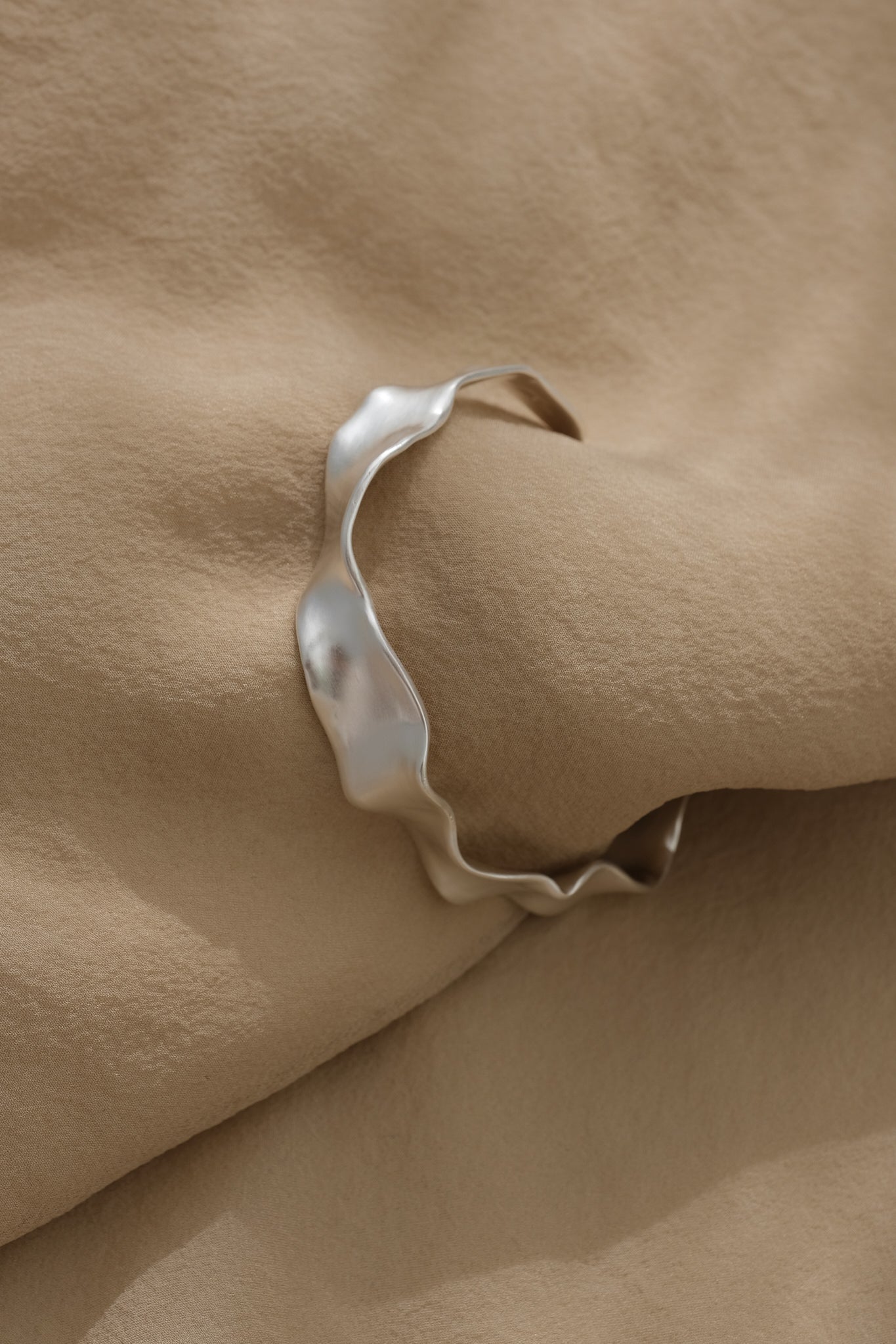 Licht trifft auf Wasser, Reflexionen tanzen sich in faszinierende Formen. Schimmernd mit der Natürlichkeit von Perlen besetzt, kräuseln sich Silberstücke zu ausdrucksstarken Gebilden. Jedes Stück besteht aus recyceltem 925er Silber und poliert zu einer glänzenden oder matten Oberfläche, je nach den Eigenschaften des Designs. Sie werden in unserem Atelier von Hand geformt, was ihnen den Charme von natürlicher Unregelmässigkeit verleiht.